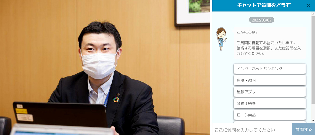 寝占様:以前、東京の会社へ出向していた際、自然言語処理やAI領域のサービスに携わる機会がありました。AIチャットボットサービスを取り扱うベンダーとのやりとりを経て想像以上に認識率が高いことを知り、弊行でも取り入れるべきソリューションだと感じ、導入へと至りました。